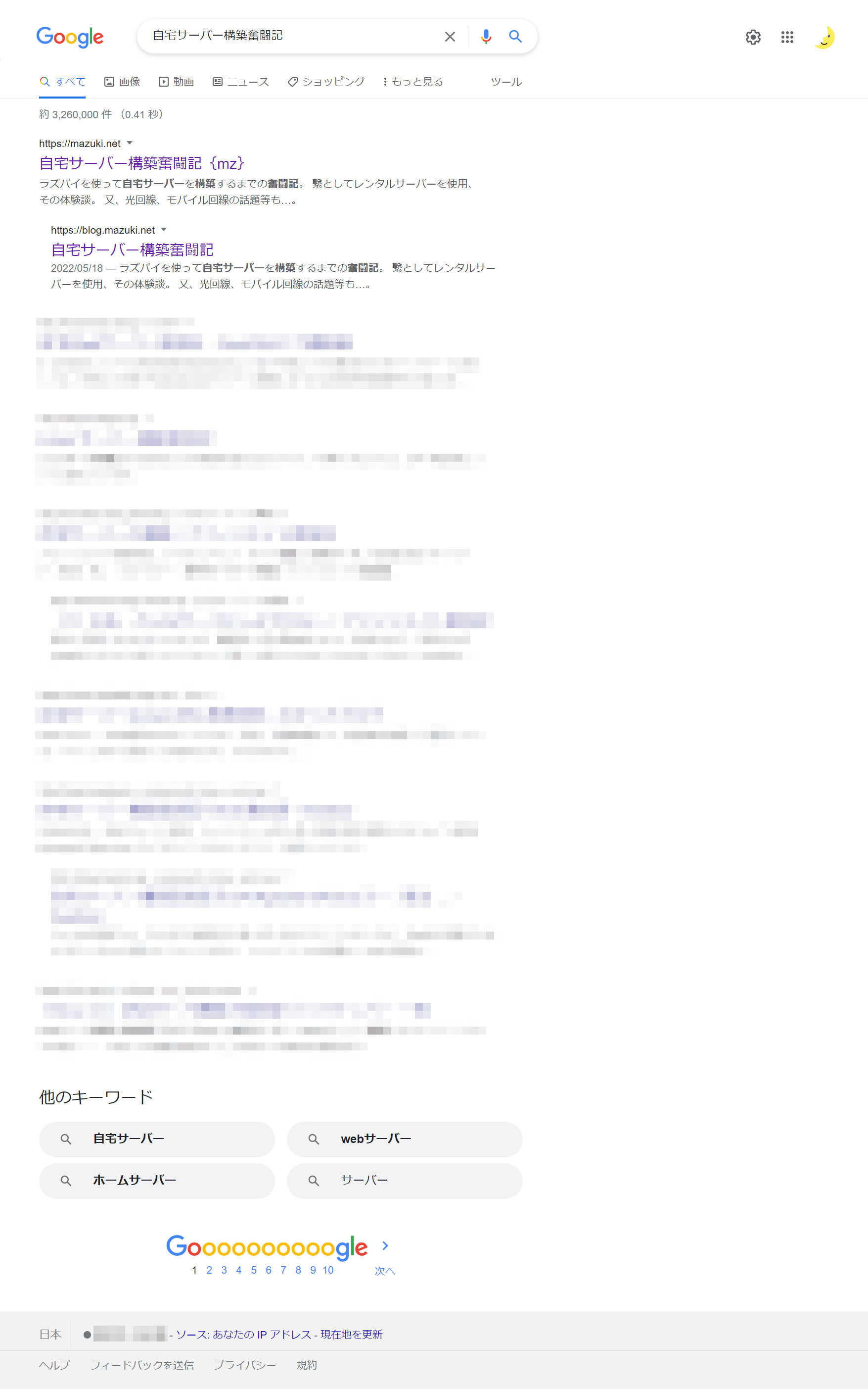 Google検索エンジンで今現在のブログタイトル名「自宅サーバー構築奮闘記」で検索してみた結果、最上位に表示されたのは有り難い事ではありますが、ここで問題が発生しました。